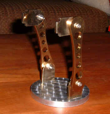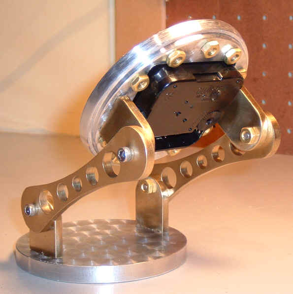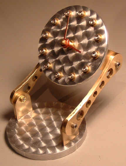 I decided that a clock would make a good first CNC project on my Sherline CNC equipped bench mill. I cut a few other little bits & pieces before this but nothing too serious. This is an original design of mine and cut on my basement workbench from aluminum and brass retrieved from the local scrap dealer. I need to disassemble it and clean up a few details yet. Drop me a note |