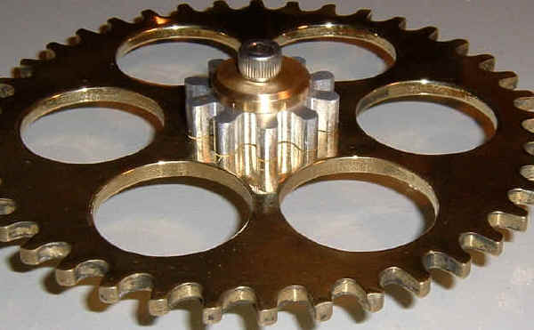 P19 wheel above The plan called for the 40 tooth wheel and the 10 tooth pinion to be glued together. I didn't want to do that. So, I drilled two additional holes, 1/8" diameter, 1/4" on either side of the center in each gear. Then, I inserted a piece of 1/8" aluminum rod into each and trimmed to length. They don't need to be glued or screwed into place as they get sandwiched between the back side of the shaft and the washer and socket screw on the front. This locks them together quite nicely. See next photo. |