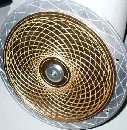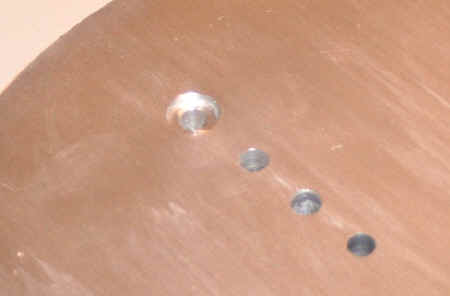 P19 wheel I've changed this a bit. The plan called for a different decorative hole pattern ( at least I hope it was just decorative). The original holes came too close to the center hole for my needs. I needed to drill two additional holes - one on either side of center. These are 1/8" each. See the next photo. |