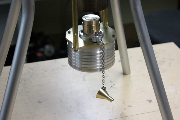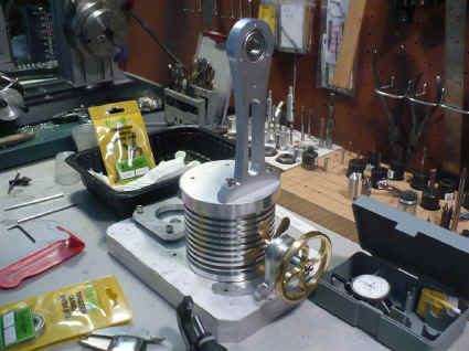 The drive pulley finished. This will connect to the fan pulley below to turn the cooling fan to keep the displacer cylinder as cool as possible. ( The shaft shown is is temporary. ) | |
