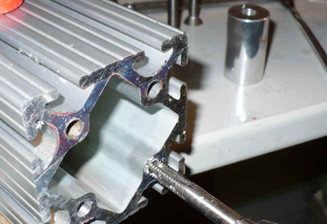 The 8020 extrusion is designed to be tapped 5/16". I ran the tap in the full length. |