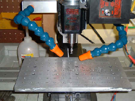 I liked the use of a vacuum but holding it got boring very quickly. So, I bought some square tubing and some 3/4" Loc-Line. Then drill and thread the aluminum tubing, make up a couple of end-caps, buy some 1.50" tubing and a used domestic canister vacuum ( and some ear plugs), and you're done. I find that I'm often fiddling with the placement of the nozzles and will add one more. Narrow deep cuts are the toughest to keep clear. When the cutting is all done it sure is a lot smaller mess to clean up. My next addition, after the 3rd vacuum line, is to add a compressed air line to blow the chips out of those deep narrow cuts. See the article at Omikron's web site. |