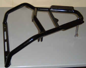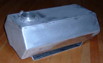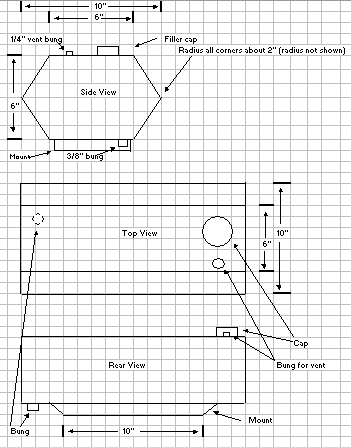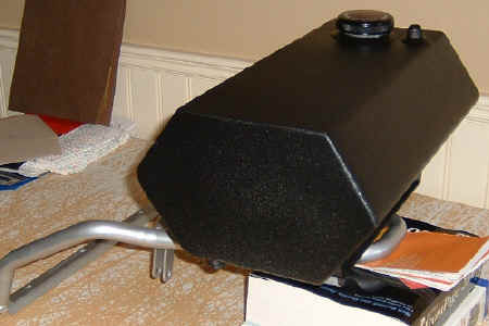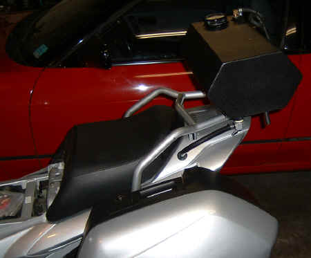 [July 2006 Update; The damn rack broke, never to be used again.) The added weight of the gas from mounting the tank up top is no big deal. I had a similar sized tank on my Concours and never noticed it was there. As for sloshing, it doesn't really start to move around much until the tank is down to about the half full mark. By that time, it doesn't weigh much. I never felt any movement from the Concours aux tank. I'm not going to worry about baffles or tank foam. |