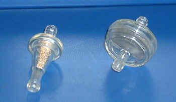 You may want an inline fuel filter or two as well. Carry a spare. If it clogs up, you may be hooped until you find another one. Or get one of those fancy dancy aluminum body models that you can clean all the schmegma out of. Remember to be sure that you orient the filter to the proper flow direction. There's usually an arrow on the casing. I just cleaned out the filter on my Concours. After seeing the crud in there, damned rights I'll put one on the FJR.. It was the one on the right. Now, in hindsight, that's the one to go with as they are easy to clean if you don't have a new one on hand. | |